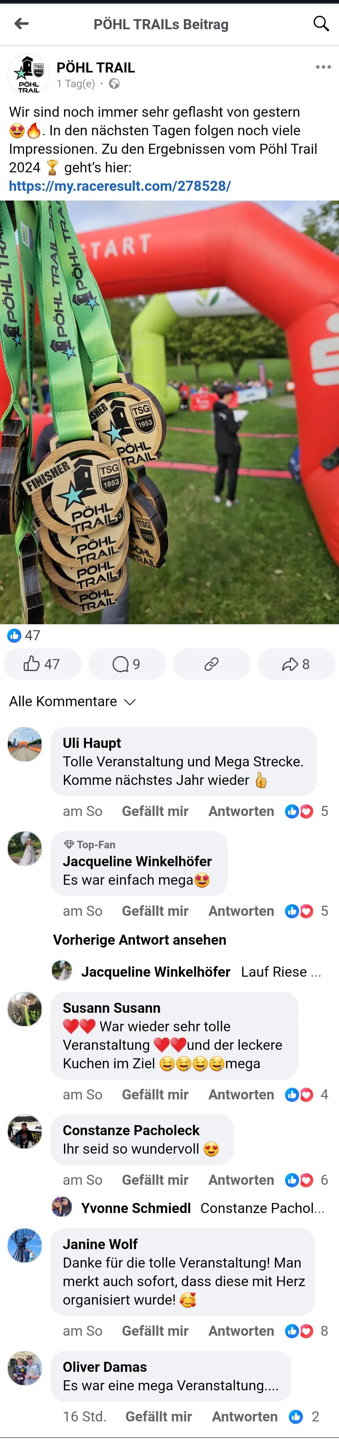 Auf dieser Seite findet ihr nun Ergebnisse, Bilder und Impressionen, Feedback vom Pöhl-Trail 2024.