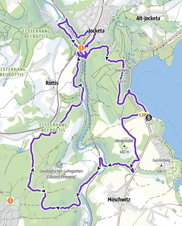 Start und Ziel ist des Wassersportzentrum an der Talsperre Pöhl (Gunzenberg). Von dort aus geht es zunächst leicht bergan bis unterhalb des Königshübels und danach ins Tal der Weißen Elster, vorbei am Lochbauer. Anschließend folgt die Strecke dem Elsteruferweg bis zum Unteren Rosenbach. Von hier aus lauft ihr durch den Wald über den Berg und anschließend hinunter zur Pfaffenmühle und weiter zur Weißen Elster. Dann wieder hoch nach Röttis, zum Friedrich-August-Stein und wieder hinunter zur Weißen Elster. Danach geht es noch entlang des Elsterufers durch die Elstertalbrücke bis in die Barthmühle. Anschließend folgt der nächste Anstieg hinauf nach Jocketa. Ist dieser geschafft, geht es hinunter ins wunderschöne Triebtal. Wir folgen dem Fluss eine Weile, wechseln dann zum linken Flussufer und verlassen das Triebtal in Richtung Altjocketa. Bergan geht es weiter durch den Wald in Richtung Ruppertsgrün. Über die Ziegelhüttenstraße und den Panoramaweg geht es zurück nach Altjocketa. Das Ziel schon in Sicht, gönnen wir uns nochmal einen Besuch des Tosbeckens vor der Staumauer. Von hier an geht es weiter hinauf zum Eisenberg und abschließend bergab zur Talsperre Pöhl, vorbei an der Schiffsanlegestelle zum Ziel.